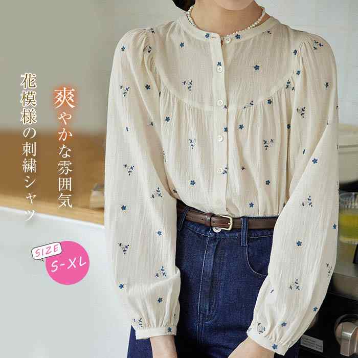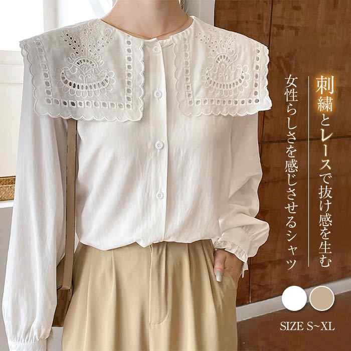 シャツ レディース 長袖 トップス 夏 レディースシャツ 春 春秋 長袖シャツ カジュアル オシャレ 刺繍 クールネック ビッグ襟 若見え 着回し レイヤード 着痩せ 20代 30代 40代 50代