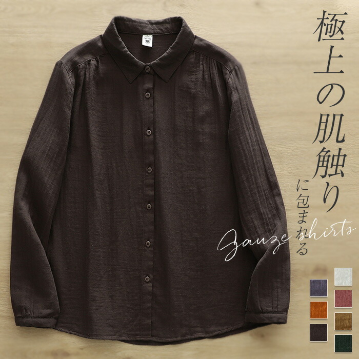 シャツ レディース 長袖 ガーゼ ブラウス おしゃれ オフィス 面接 トップス ダブルガーゼ コットン 綿100% 丸襟 前開き カジュアル 無地 体型カバー オフェス シンプル 着回し 通勤