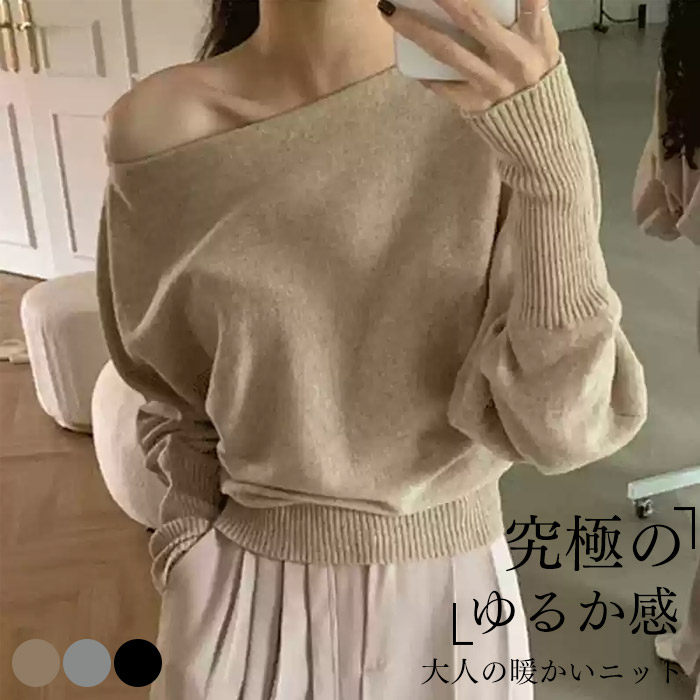 ニット オフショルダー レディース 長袖 オープンショルダー セータートップス フェミニン 着回し シンプル おしゃれ 大人 カジュアル こなれ感 春 秋 柔らかい 個性的 トレンド感