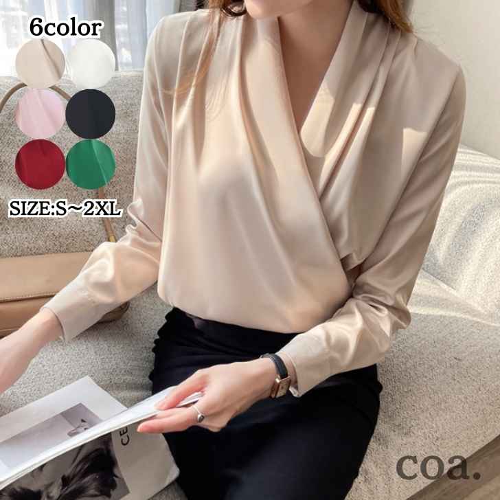 ブラウス レディース 春夏秋 長袖トップス オシャレブラウス 白レーヨンシャツ フレアvネック オフィスブラウス