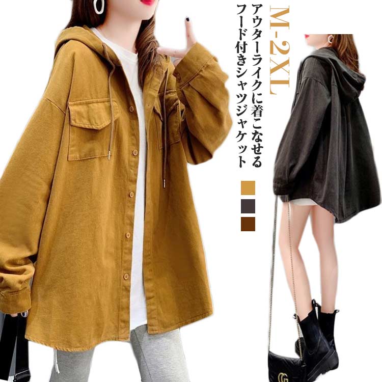フード付き長袖シャツ シャツジャケット ビッグシルエット カジュアルシャツ フード付き ワークシャツ 20代 30代 40代