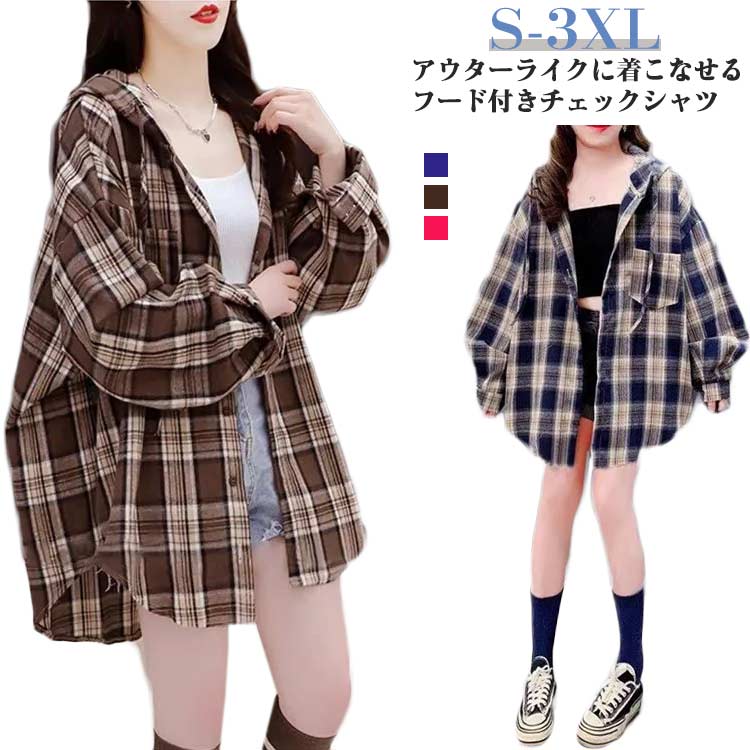 フード付き長袖ネルシャツシャツ シャツジャケット ビッグシルエット カジュアルシャツ フード付き 20代 30代 40代
