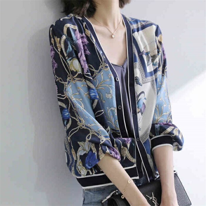 薄手 カットソー スカーフ柄 かっこいい カーディガン トップス レディース きれいめ コート ジャケット アウター シフォン 羽織 カジュアル おしゃれ 上品 韓国 コーデ ブルー 春 夏 秋 20