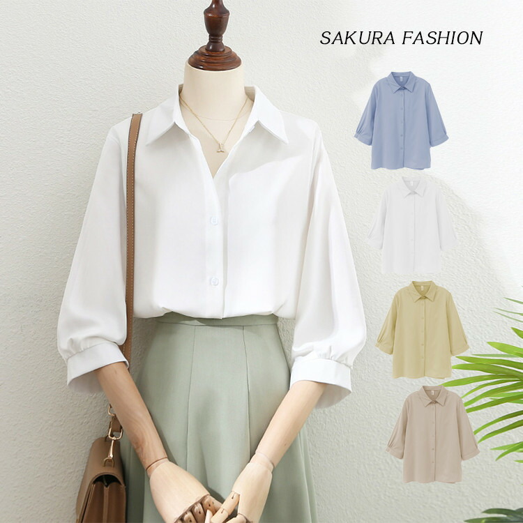 ブラウス レディース オフィス 白 フォーマル 七分袖 五分袖 ホワイト イエロー 杏色 ブルーレディースファッション トップス シャツ ブラウス