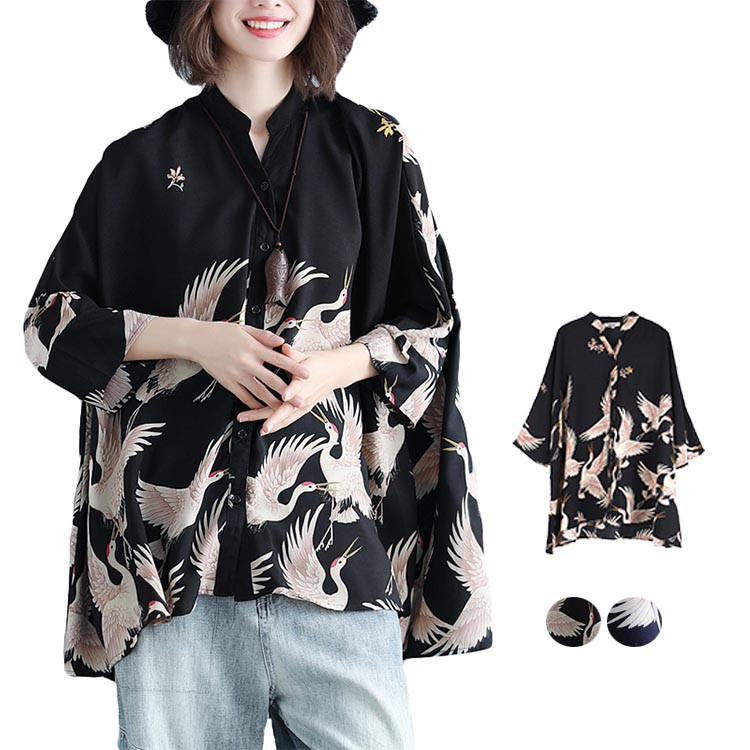 アロハシャツ 七分袖 レディース トップス シャツ シャツブラウス 7分袖 長袖 ビッグサイズ オーバーサイズ 和柄 鶴柄 スキッパーブラウス 羽織 春夏