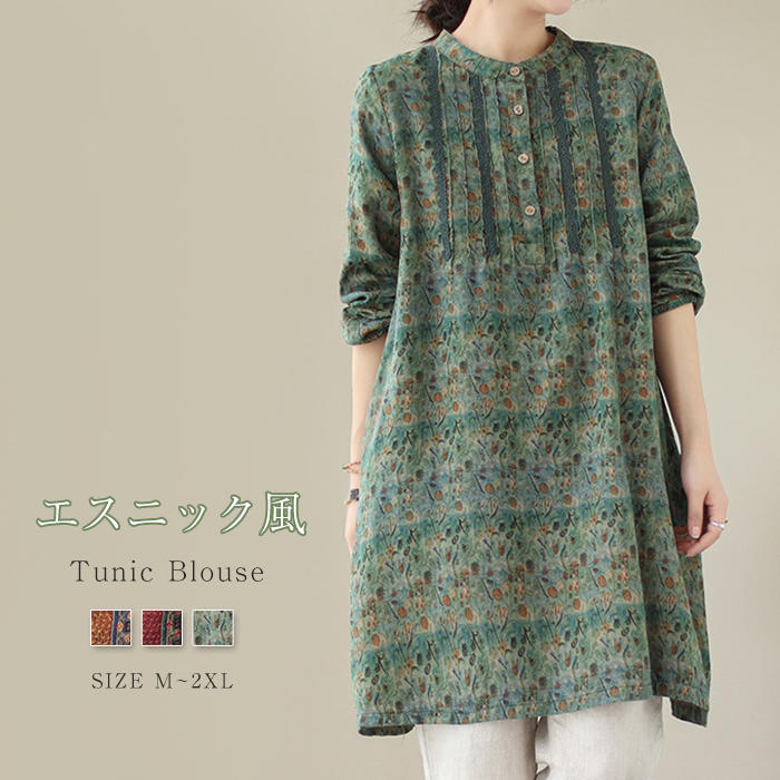 総柄 ブラウス 春 夏 レディース 長袖 薄手 ミモレ丈 シャツ シャツブラウス レディース チュニックシャツ トップス チュニック カジュアル 春夏 大人 レトロ 大人可愛い 40代