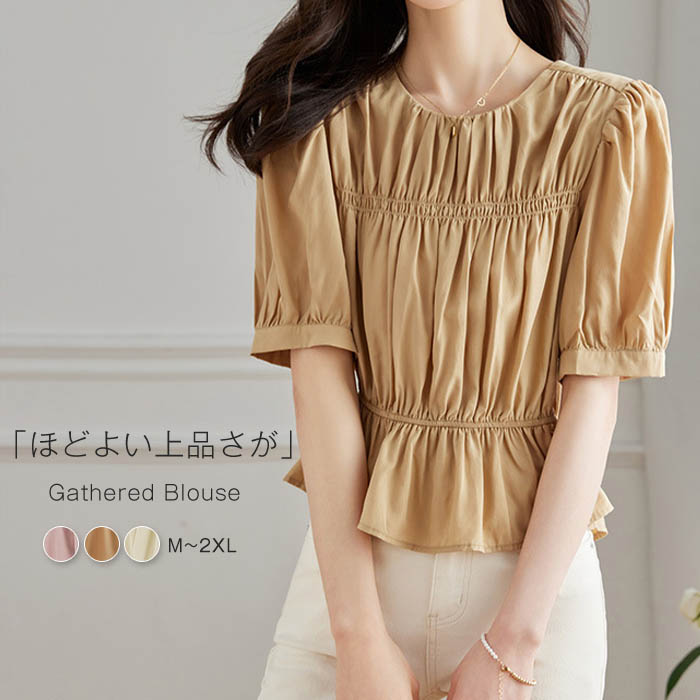 ブラウス 入学式 半袖 レディース 卒業式 オフィス クルーネック ファスナー付き 上品 バルーン袖 ギャザー トップス プルオーバー デザイン シャツ ブラウス レディース 夏