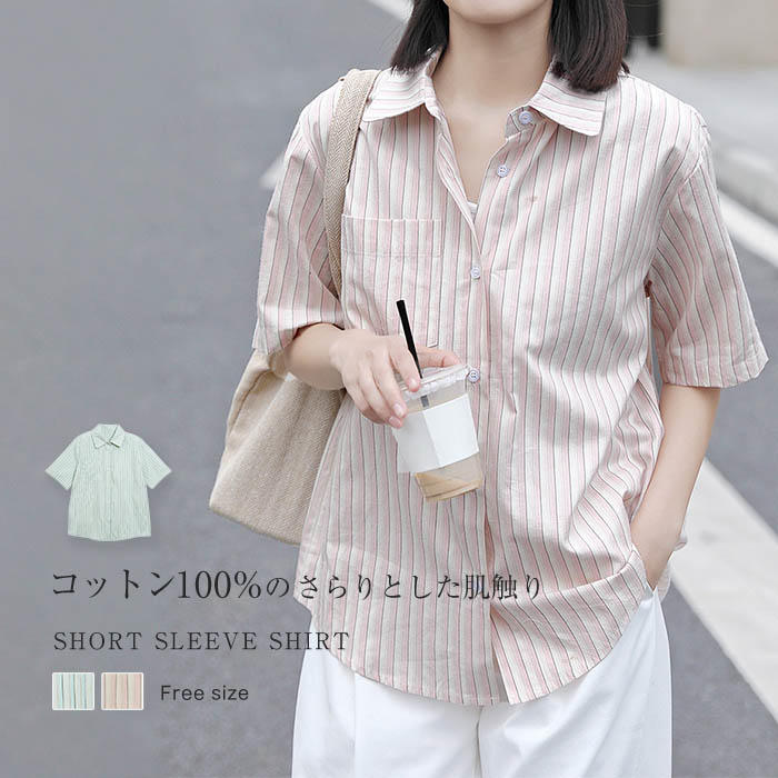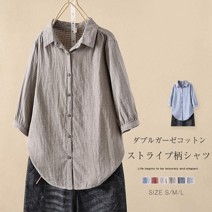 ダブルガーゼ シャツブラウス レディース 半袖 ストライプ シャツ ブラウス トップス シンプル ゆったり 大きいサイズ オフィス カジュアル 柔軟 通気性良く ナチュラル ガーゼ 綿