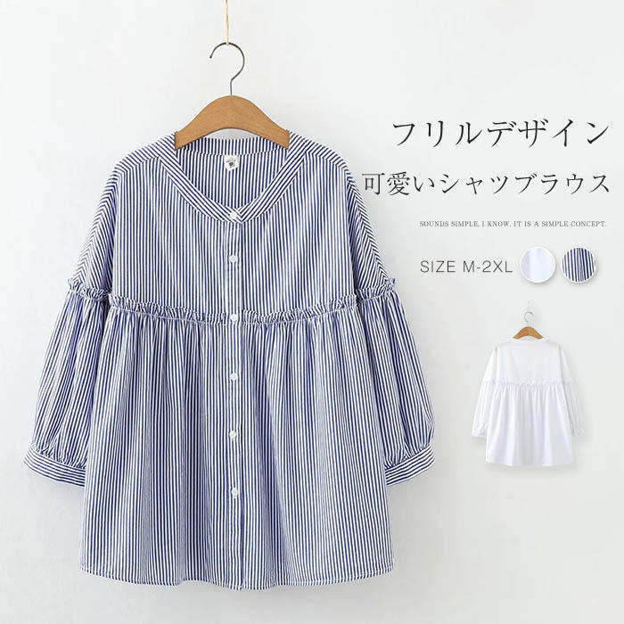 フリル シャツ ブラウス レディース シャツブラウス 五分袖 ブラウス フリル 可愛い ブラウス 切り替え 体型カバー 甘可愛い 無地 ストライプ トップス バンドカラー 定番 綿 コットン