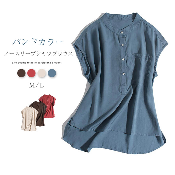 綿100% ノースリーブ シャツ ブラウス レディース 夏 薄手 バンドカラー フレンチスリーブ シャツブラウス 無地 シンプル ポケット付き 裾前後差 きれいめ オフィス カジュアル OL 夏