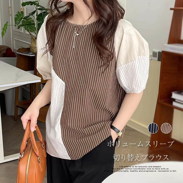 ストライプ柄 切り替え ブラウス レディース パフスリーブ ボリューム袖 夏 半袖 パフ袖ブラウス 配色 ストライプ シンプル お洒落 可愛い キレカジ ゆったり トップス 30代 40代 50代
