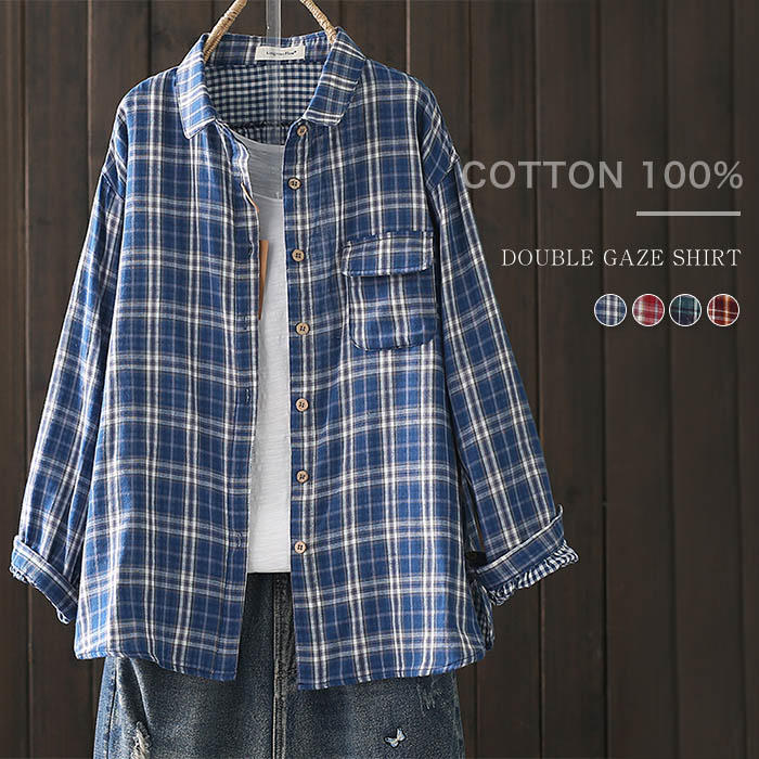綿100% チェック 配色 ガーゼ シャツ レディース ダブルガーゼ ガーゼシャツ トップス 綿 シャツブラウス レディース 長袖 はおり トップス 春 秋 羽織り シャツカーディガン 重ね着 大人