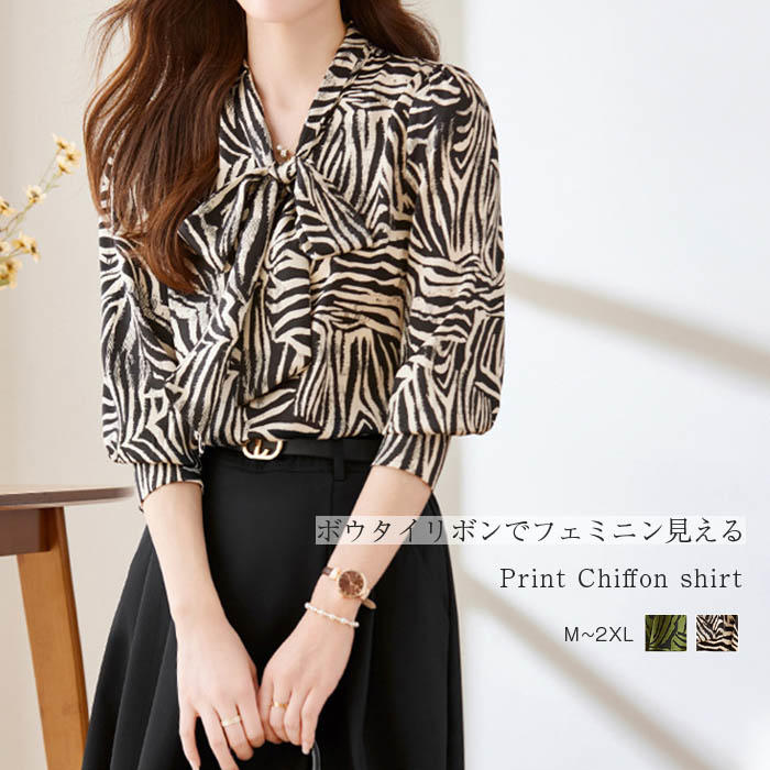 ボウタイリボンでフェミニン見える 総柄シフォンブラウス レディース きれいめ 大人お洒落 上品 OL オフィスカジュアル 30代 40代 春 夏 秋 高級感