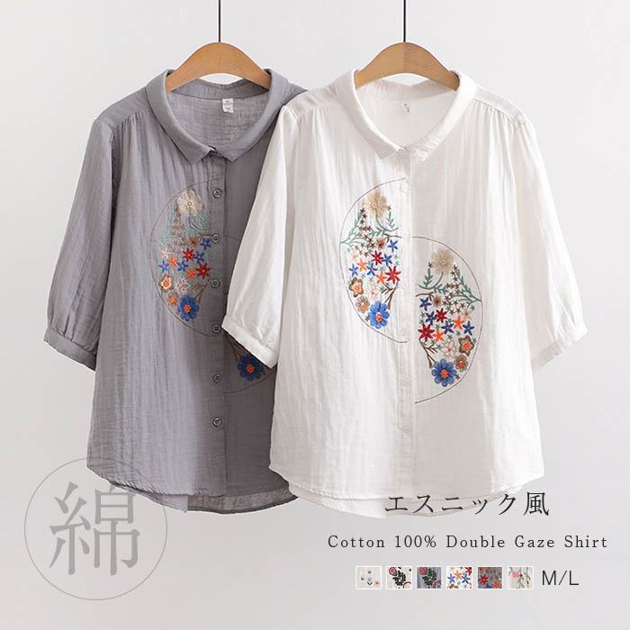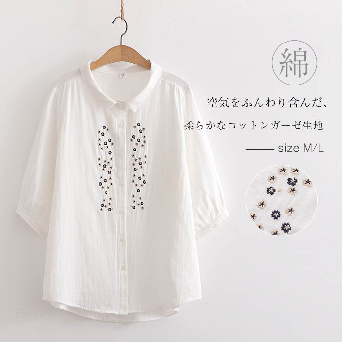 コットン100% シャツブラウス レディース 5分袖 花柄 刺繍 シャツ ブラウス トップス カジュアル 無地 シンプル ゆったり 大きいサイズ 柔軟 通気性良く ナチュラル ガーゼ 綿
