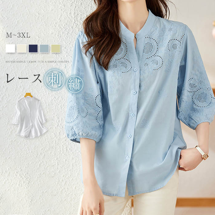 綿100% シャツブラウス レディース レース 花柄 刺繍 シャツ ブラウス 七分袖 春夏 春 夏 トップス レースブラウス バンドカラー 可愛い ゆったり 透け感 体型カバー 白 ホワイト ブルー
