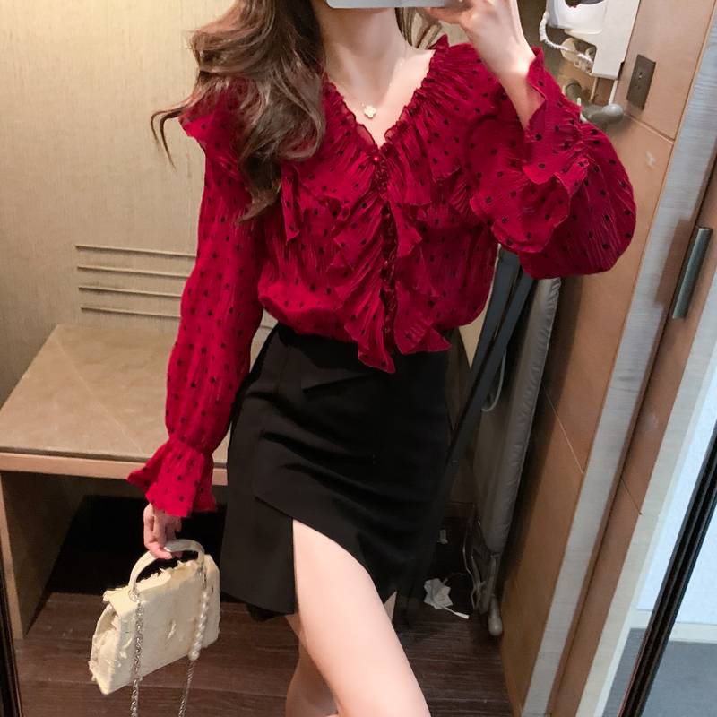 トップス レディース ブラウス シャツ 長袖 秋 冬 ドット柄 レッド フリル Vネック イベント 休日 お出かけ デート コーデ パーティー イベント ファッション エレガ