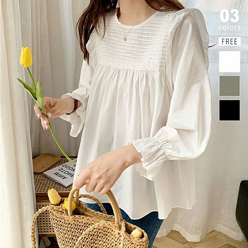 ブラウス ショルダーフリル チュニック レディース 長袖 春 トップス フリル 肩フリル フレア ゆったり 体型カバー ボリュームスリーブ ボリュームスリーブブラウス プルオーバー 七分袖 刺繍 楽ち