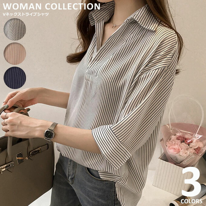 チュニック 7分袖 ゆったり オフィスカジュアル OL 開襟 きれいめ 大人 ストライプ柄 ストライプシャツ ビジネス シャツブラウス 着痩せ vネック