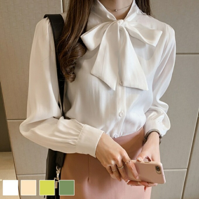 エレガント こなれ感 入学式 上品 大人可愛い サテン 白 グリーン 韓国 シャツ フェミニン 速乾 事務服 ガーリー 可愛い スカーフ 結婚式 お呼ばれ 通勤 光沢 パフスリーブ デート