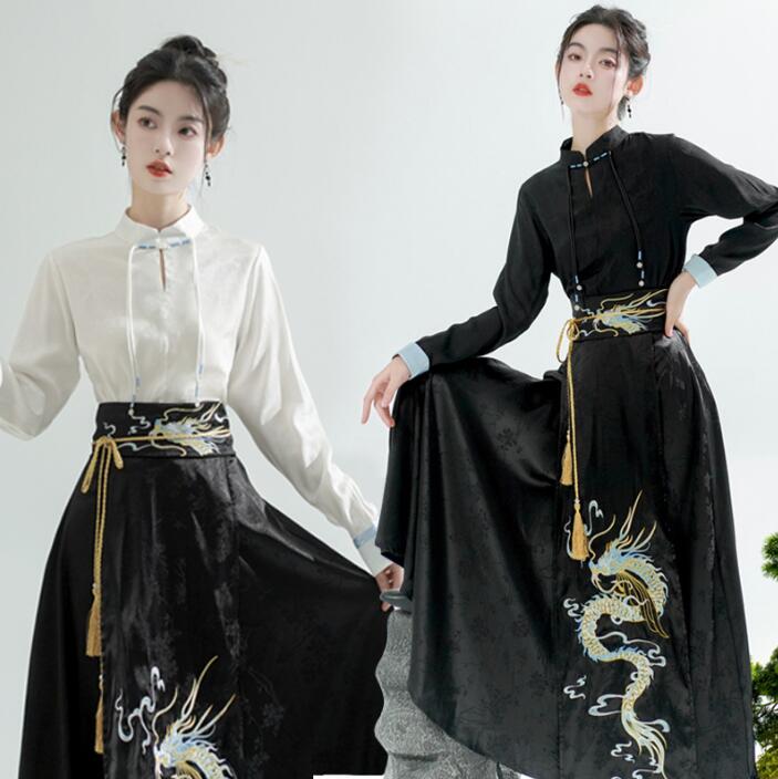 中華コスプレ衣装 レディースチャイナ漢服改良漢服唐装 コスチューム ハロウィン衣装 中華ブラウス+ロングプリーツスカート刺繍中華服 龍柄 タンチョウ エスニック 仮装 変装