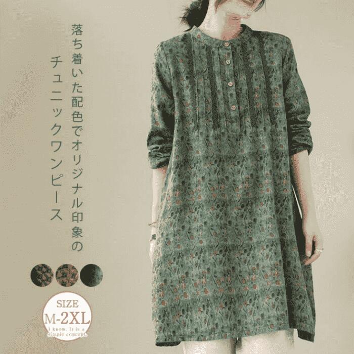 ロングシャツワンピース チュニックブラウス 配色 スタンドカラー 綿麻風 森ガール 体型カバー ワンピ 大きいサイズ