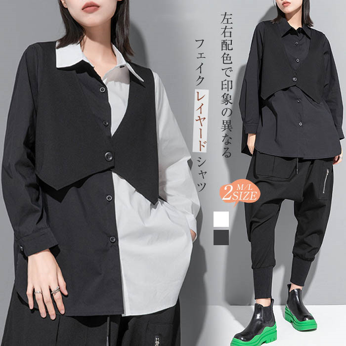 フェイクレイヤード シャツ レディース 配色 トップス ロングシャツ 春 秋 冬 デザイン 長袖 アシンメトリー 無地 個性的 ファッション ゆったり 大きいサイズ