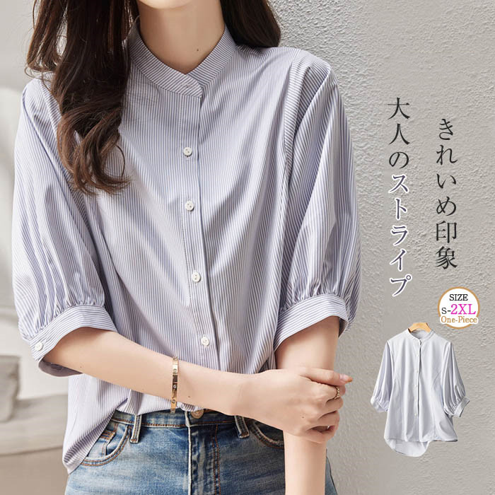 シャツ ブラウス レディース シャツブラウス 5分袖 夏 ストライプ バンドカラー トップス シンプル パフスリーブ ゆったり 体型カバー 大きいサイズ きれいめ
