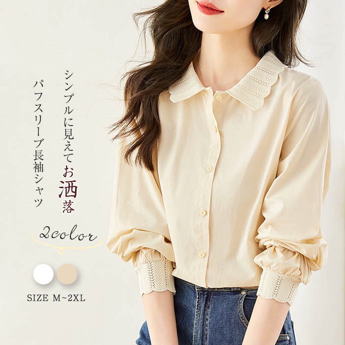 シャツ ブラウス レディース シャツブラウス 長袖 春 秋 トップス シンプル パフスリーブ ゆったり 体型カバー レース きれいめ 切り替え タック 通勤 オフィス 着回し