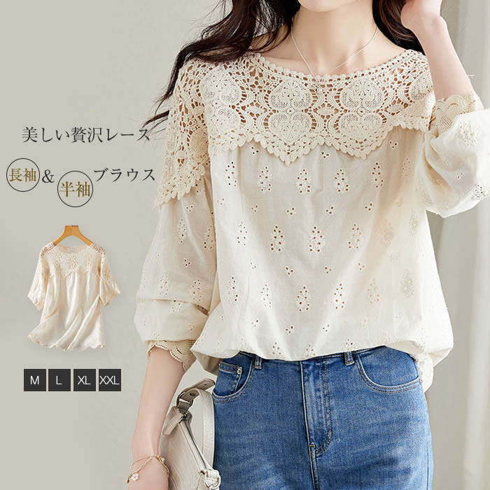ブラウス レディース レース 花柄 刺繍 半袖 長袖 春夏 春 夏 秋 トップス プルオーバー レースブラウス クールネック 可愛い ゆったり 透け感