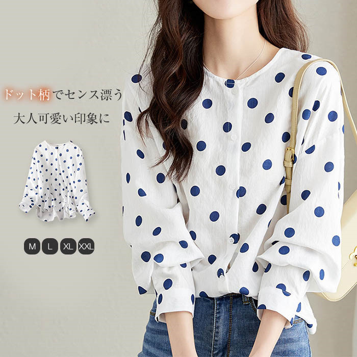 シャツ ブラウス レディース ドット シャツブラウス 長袖 春 夏 薄手 トップス シンプル ノーカラー ドット柄 ゆったり 体型カバー 大きいサイズ