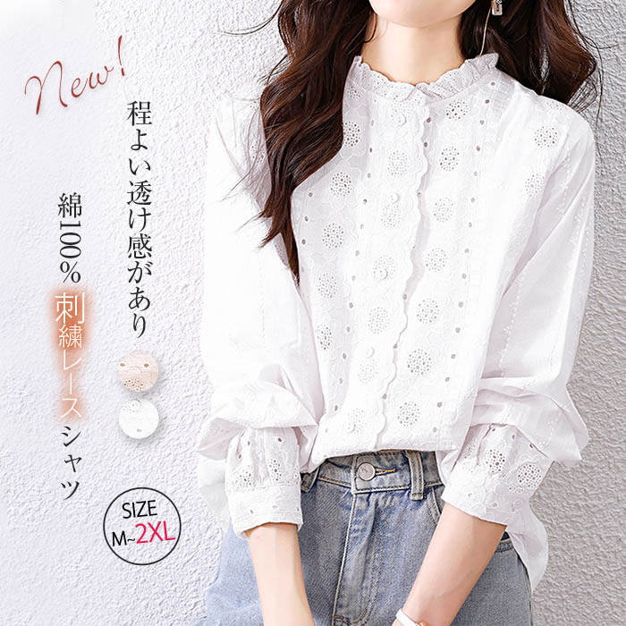 シャツ ブラウス レディース レース 花柄 刺繍 長袖 春 夏 秋 薄手 シャツブラウス トップス 刺繍シャツ フリル レース襟 可愛い ゆったり 体型カバー オリジナル きれいめ 通勤