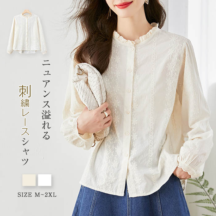 フリル 襟 シャツ ブラウス レディース レース 花柄 刺繍 長袖 春 秋 シャツブラウス トップス 刺繍シャツ 可愛い ゆったり 体型カバー オリジナル 上品 きれいめ 通勤 オフィス