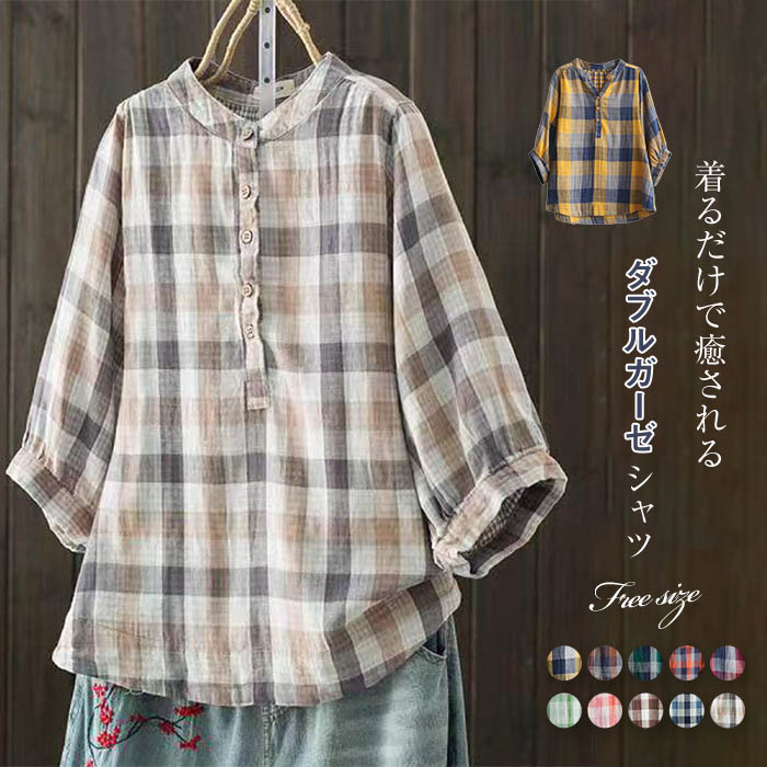 ダブルガーゼ 綿100% シャツブラウス レディース 夏 ガーゼシャツ シャツ ブラウス 半袖 トップス 綿 カジュアル トップス チェック ゆったり ゆる