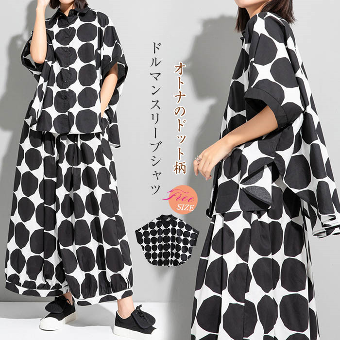 シャツ ブラウス レディース シャツブラウス 半袖 個性的 夏 ドット柄 トップス デザイン ドルマンスリーブ ゆったり 体型カバー 大きいサイズ ゆる