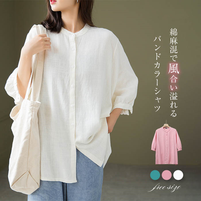 シャツ ブラウス レディース シャツブラウス 7分袖 夏 春 バンドカラー トップス リネンシャツ シンプル ゆったり 体型カバー ゆる チュニック 羽織り