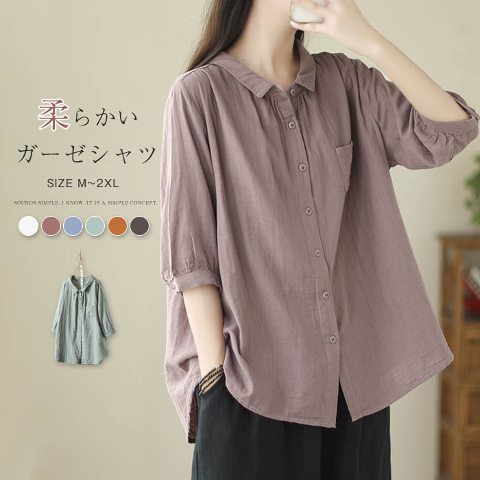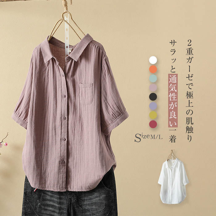 ガーゼ シャツ 2重ガーゼ シャツブラウス レディース 半袖 トップス 春 夏 ガーゼシャツ 羽織り 半袖ブラウス 大人 カジュアル ナチュラル