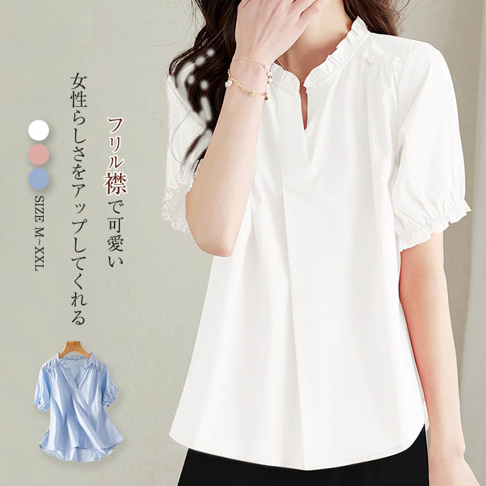 フリル 襟 ブラウス レディース 夏 半袖 シャツブラウス プルオーバー トップス カジュアル 綿100% 大人 可愛い ギャザー コットン シンプル ゆったり ゆる