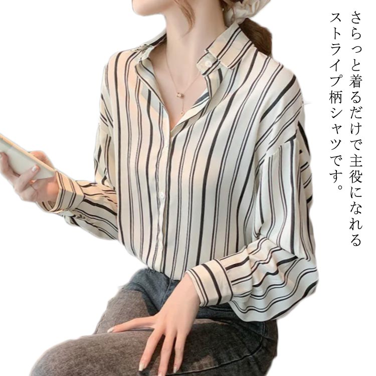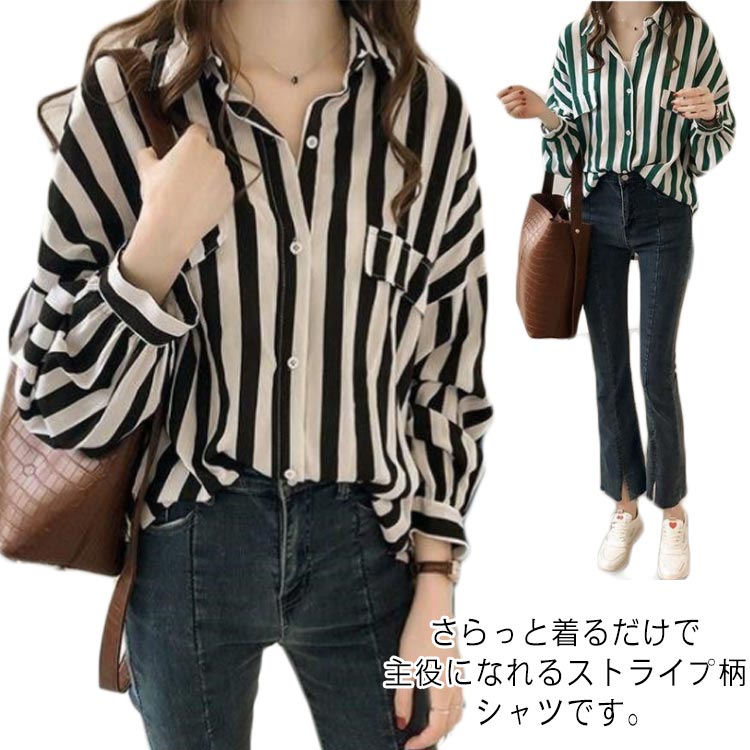ブラウス シャツ ストライプ柄 カジュアル ゆったり シンプル オシャレ カットソー 長袖 トップス