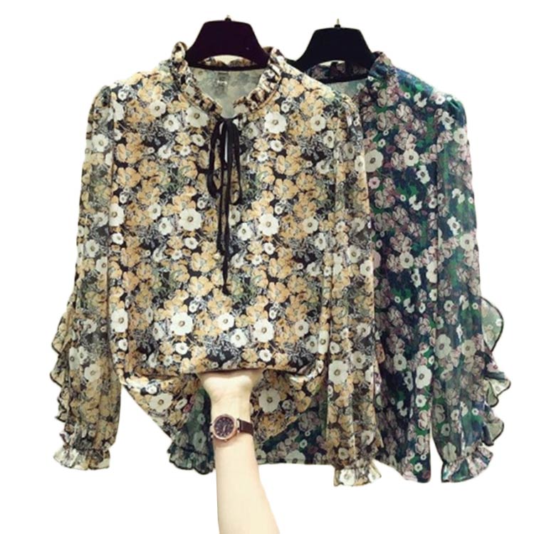 ブラウス レディース シャツ 長袖 柄 ハイネック フリル 総柄 韓国ファッションレディースファッション トップス シャツ ブラウス