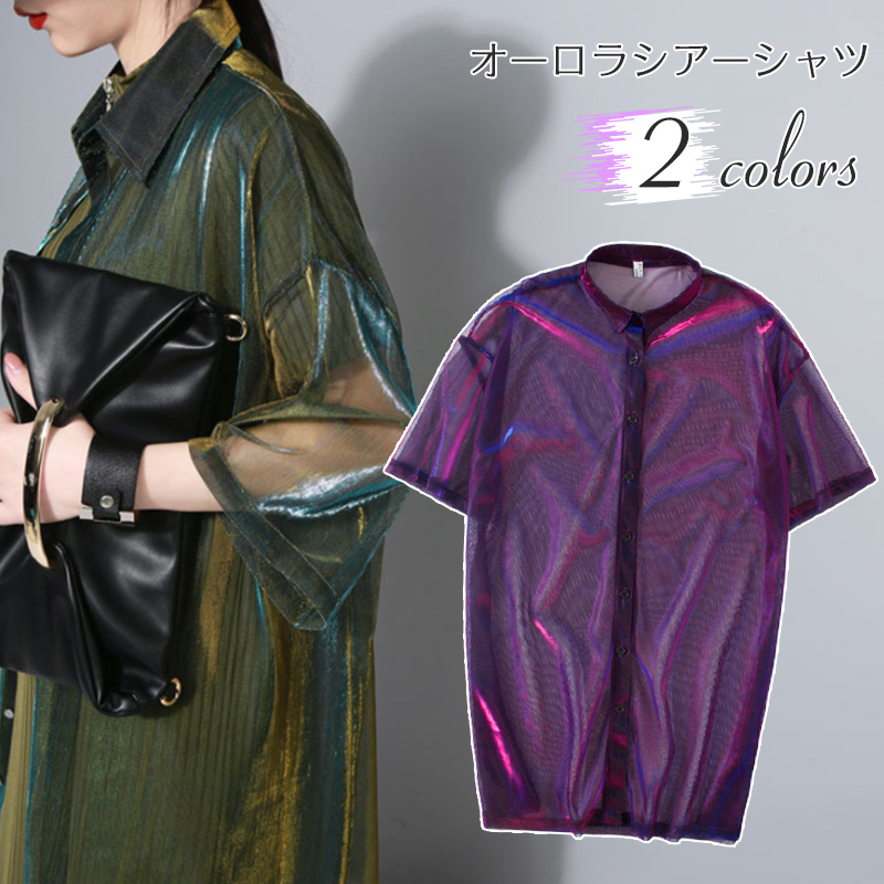 シャツ ブラウス シースルー 2カラー トップス シアーシャツ オーロラ 透け感 光沢ダンス 衣装 グリーン パープル 羽織 襟付き ビックシルエット 文化祭 発表会 学生