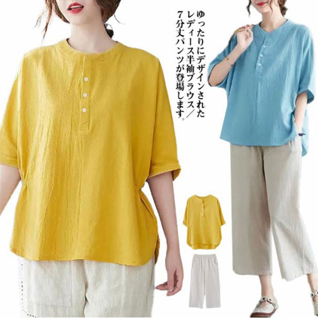 7分丈 半袖 シャツ ブラウス レディース ワイドパンツ レディース 夏 綿麻レディースファッション トップス シャツ ブラウス