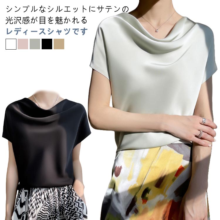 シルクタッチ サテンシャツ 半袖 ゆったり フレンチ袖 半袖tシャツ フレンチ サテンブラウス 半袖シャツ 光沢 30代 ケープ風 女性 20代 楽チン 40代 フォーマル オシャレ クールネック