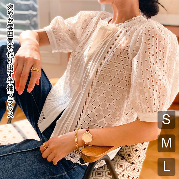 ブラウス シャツ チュニック レースブラウス シャツブラウス 半袖 トップス レディース 中空のデザイン 半袖シャツ 綿100% 丸ネック 可愛い 無地 ゆったり 着痩せ レース飾り