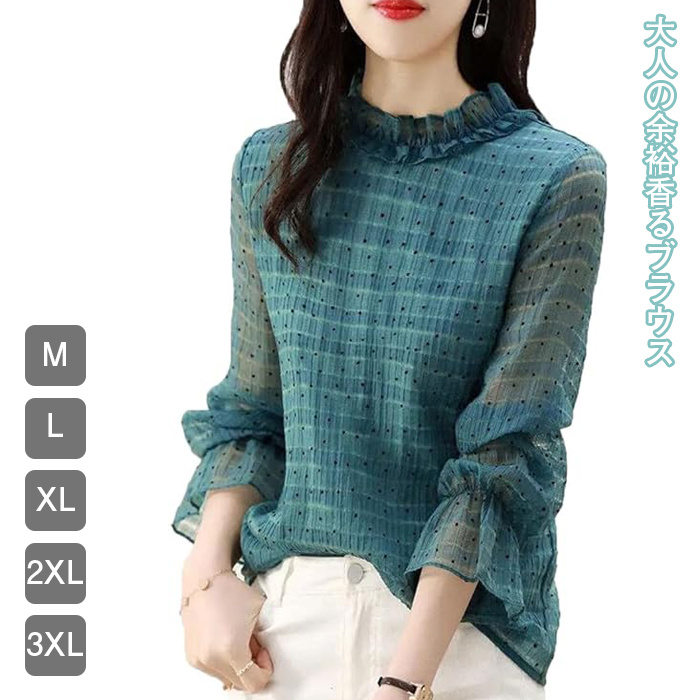 ブラウス レディース シャツ シャツ トップス カットソー プルオーバー シフォン チュニック とろみ フリル ドット フレア ギャザー レース チェック柄 透け感 きれいめ 立ち襟 長袖