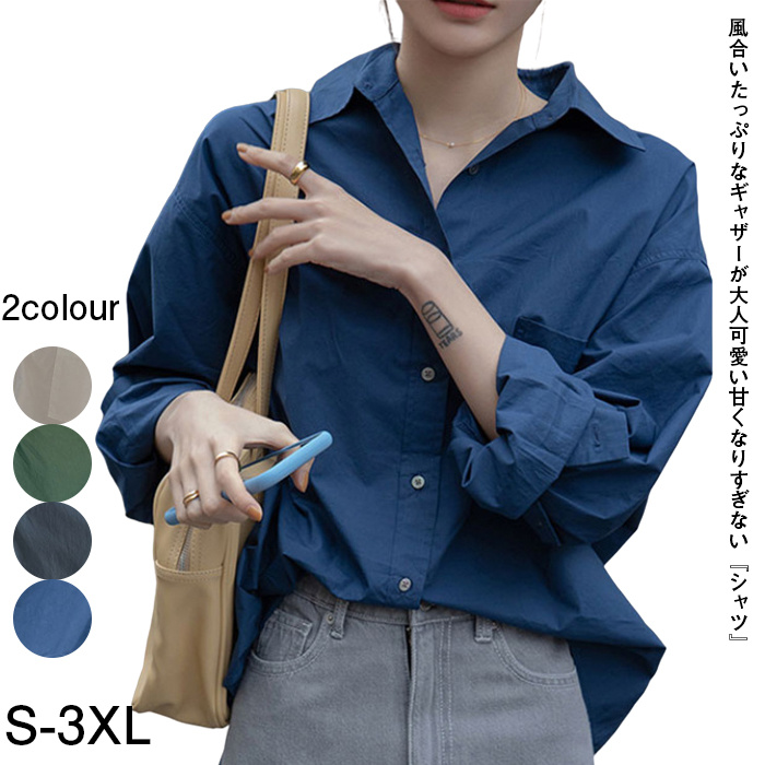 シャツ レディース 長袖 無地 レギュラーカラー シンプル ゆったり 韓国風 ファッション ホワイト グリーン ネイビー ブルー S-3XL