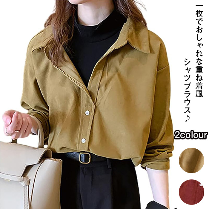 重ね着風 シャツ ブラウス レディース 長袖 トップス 開襟シャツ ハイネック レイヤード風 秋冬 -2
