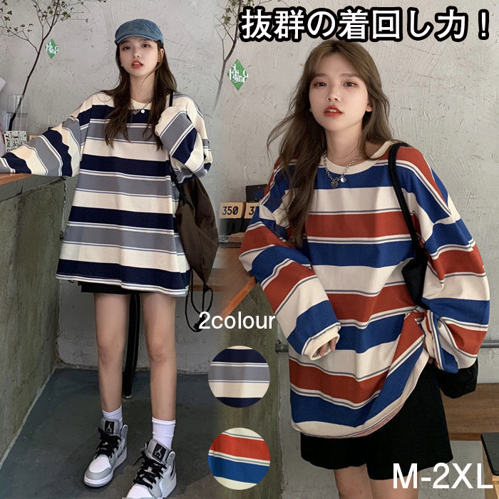 トレーナー レディース ボーダー柄 ゆったり クルーネック ロング丈 ビッグ 着痩せ 体型カバー 長袖 ビッグシルエット カジュアル ファッション カラフル 可愛い 通学 日常 部屋着