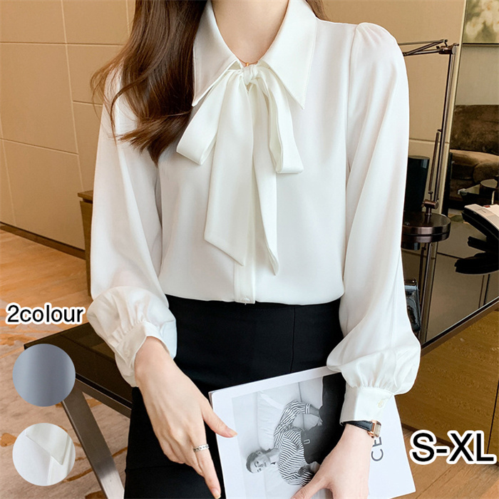 シャツ レディース ブラウス トップス 長袖 角襟 リボンタイ エレガント おしゃれ 可愛い ゆったり 体型カバー 大人 スッキリ ファション オフィス カジュアル フォマール