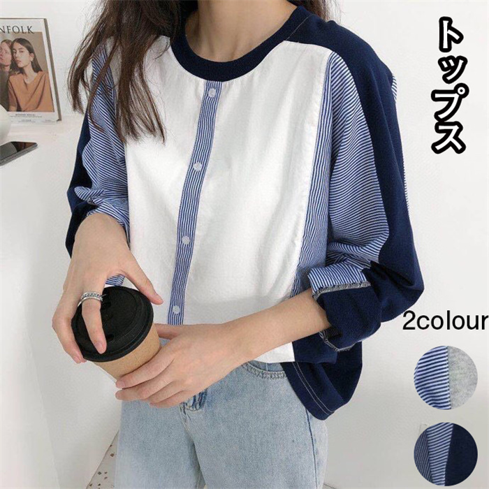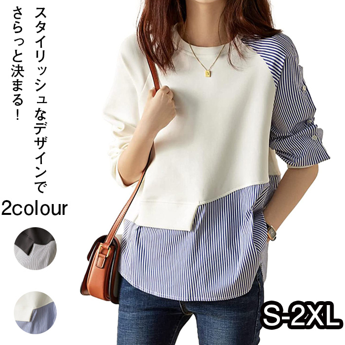 トップス 異素材ドッキングトップス ストライプ レディース シャツ 飾りボタン プルオーバー 大人カジュアル 長袖 フリーサイズ
