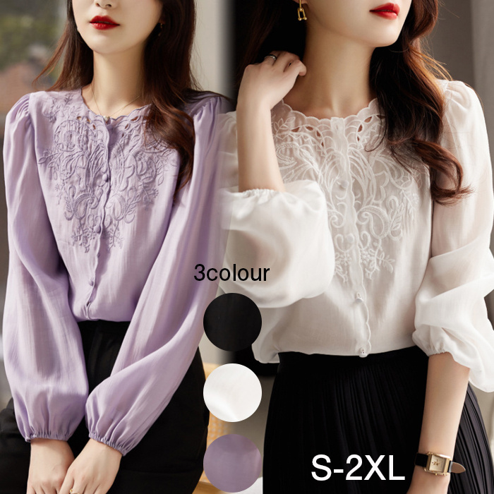 刺繍シフォンブラウス シャツ レディース ボタニカル柄 パフスリーブ 長袖 スカラップ くるみボタン きれいめ 白 黒 紫 ホワイト ブラック パープル S-2XL